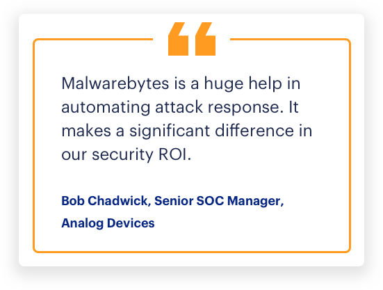 Malwarebytes Incident Response es el estándar de confianza en la corrección automatizada de endpoints. La solución refuerza la resiliencia cibernética de su empresa y el proceso de respuesta a incidentes al comprimir los tiempos de respuesta con una corrección rápida y completa. Con nuestro enfoque automatizado, obtiene una mayor eficiencia operativa que ahorra tiempo a los analistas, preserva la productividad del usuario y mejora la postura de seguridad de su empresa.